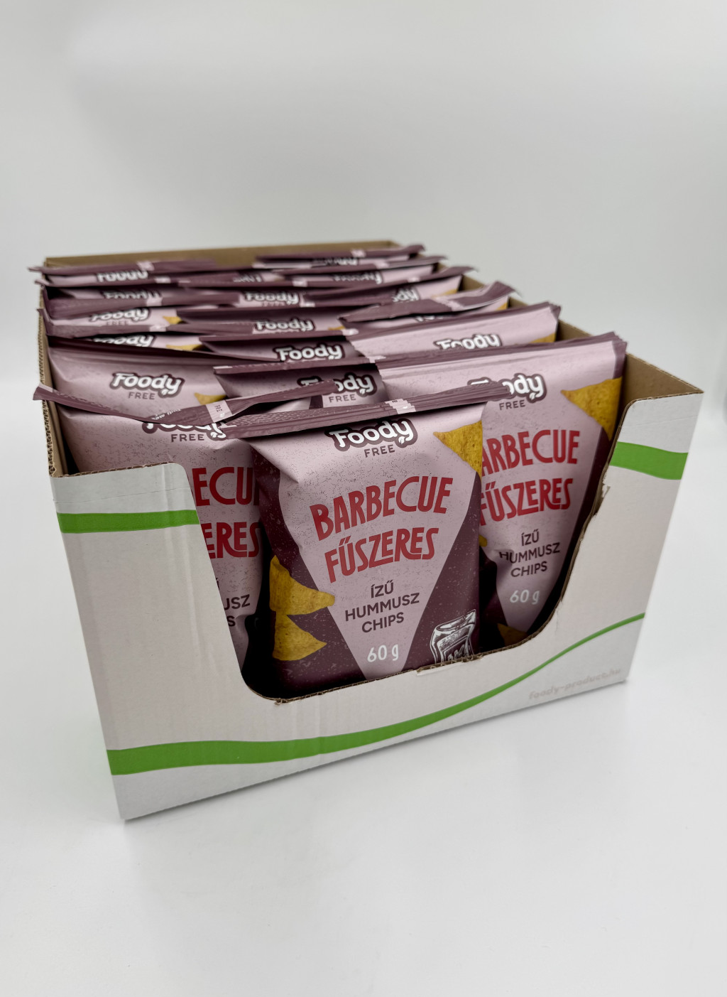 FOODY FREE INTENSE barbecue fűszeres ízű hummus chips. Összetevők: csicseriborsóliszt 28%, kukoricaliszt, rizsliszt, finomított napraforgó étolaj, barbecue ízű fűszerkészítmény 3,9% [ aromák, füstaroma, cukor, étkezési só,rizsliszt,fruktóz,maltodextrin,savanyúságot szabályozó anyag: natrium-diacetát,glükóz ]