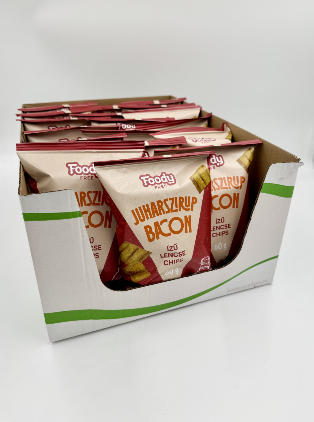 FOODY FREE INTENSE juharszirup-bacon ízű hummus chips. Összetevők: csicseriborsóliszt 28%, kukoricaliszt, rizsliszt, finomított napraforgó étolaj, barbecue ízű fűszerkészítmény 3,9% [ aromák, füstaroma, cukor, étkezési só,rizsliszt,fruktóz,maltodextrin,savanyúságot szabályozó anyag: natrium-diacetát,glükóz ]